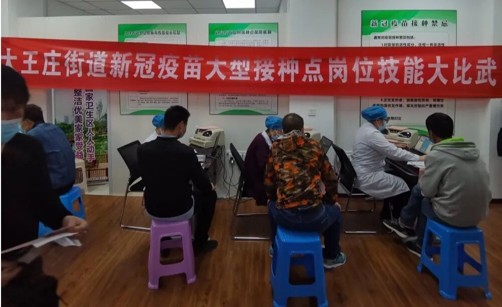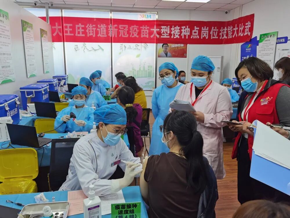 “作为区内三个大型新冠疫苗临时接种点之一,我们此次开展技能比武的目的,是以实战练兵加快从疫苗登记到接种结束的全流程质量及速度。在每天保证有序接种的前提下,将接种全流程细化分解,以赛促训,提高社区工作者及疫苗接种人员的事功,确保疫苗接种工作的优质、高效、如期完成。”大王庄街道总工会党工委副书记、工会主席杨靖介绍。此次共200余人参与的技能比武,共有针对医护人员的核查登记、预检分诊和疫苗接种单项比武,及针对社区工作者的宣传发动团体比武。以疫苗接种单项为例,由专业裁判对参赛者从操作和计时接种五人用时总时间两方面进行综合考评,最后统一计算岗位比武成绩,排出竞赛名次进行表彰。