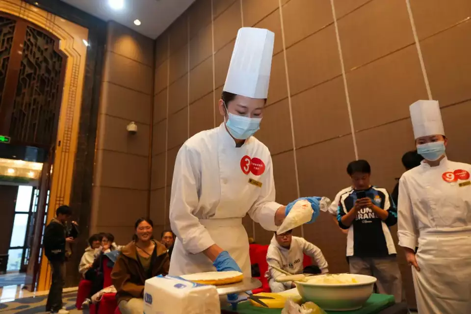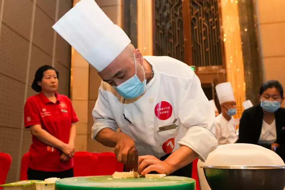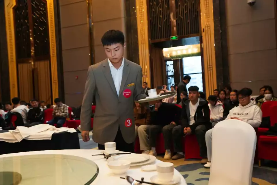 比赛过程中,各项目亮点纷呈:客房做床赛场,选手们手法娴熟,快速铺就平整美观的床品;中餐摆台环节,餐具摆放精准雅致,尽显中华饮食文化礼仪;厨房刀工比拼现场,刀起刀落间,食材被精细处理成均匀的形状。