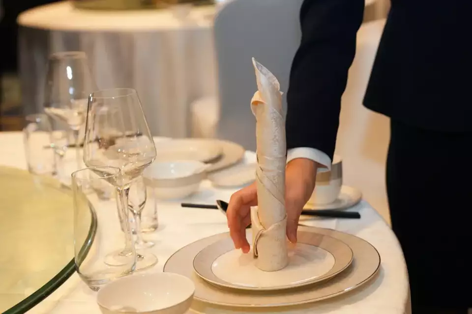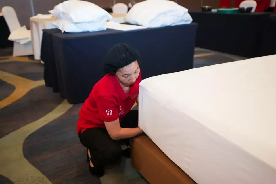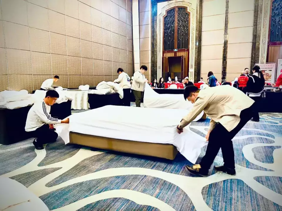 为促进产教融合,推动职业教育与产业需求深度对接,比赛特别安排河东职大学生现场观摩,四位学生代表更进行了铺床及中餐摆台技艺展示,展现了行业后备力量的扎实功底。
