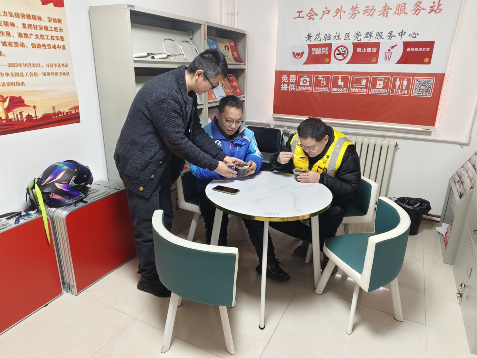 26日腊八节,天铁街道黄花脑社区工会驿站暖意浓浓。“浓情腊八·温暖相伴”关爱活动正温情开展,外卖小哥、环卫工人、快递小哥等户外劳动者受邀齐聚驿站。