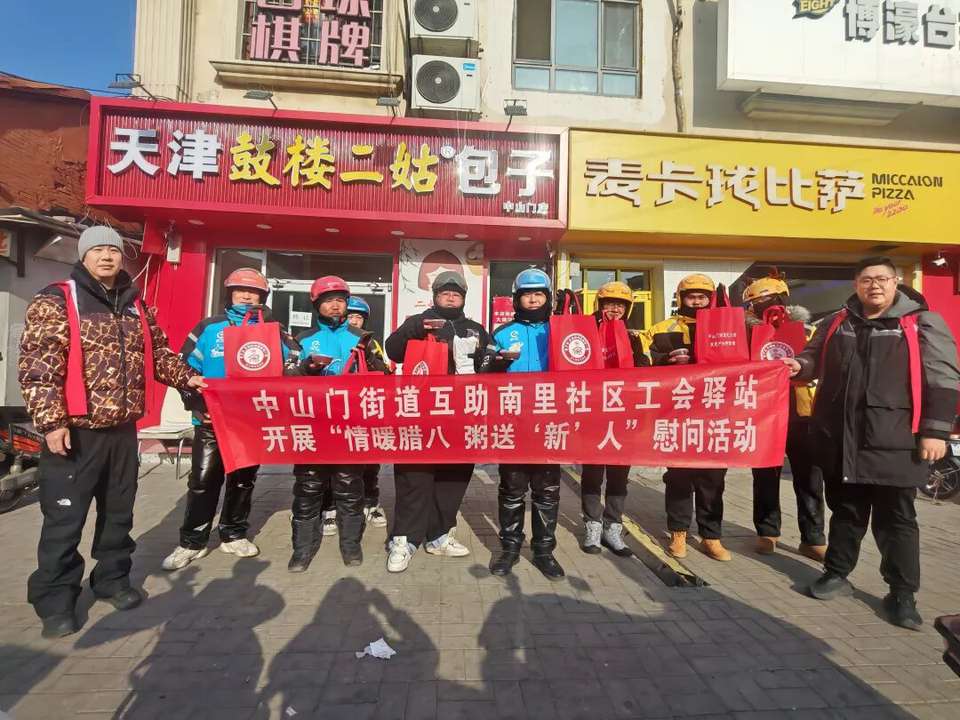 中山门街道互助南里社区党群服务中心工会驿站于腊八上午开展“情暖腊八 粥送‘新’人”腊八节慰问活动,社区工会驿站工作人员联合共建单位互助道小学及辖区企业晟安教育托管的志愿者共同行动,为奔波在一线的快递员、外卖骑手等新业态人员送上热粥与保暖物资,让寒冬腊月涌动阵阵暖意。