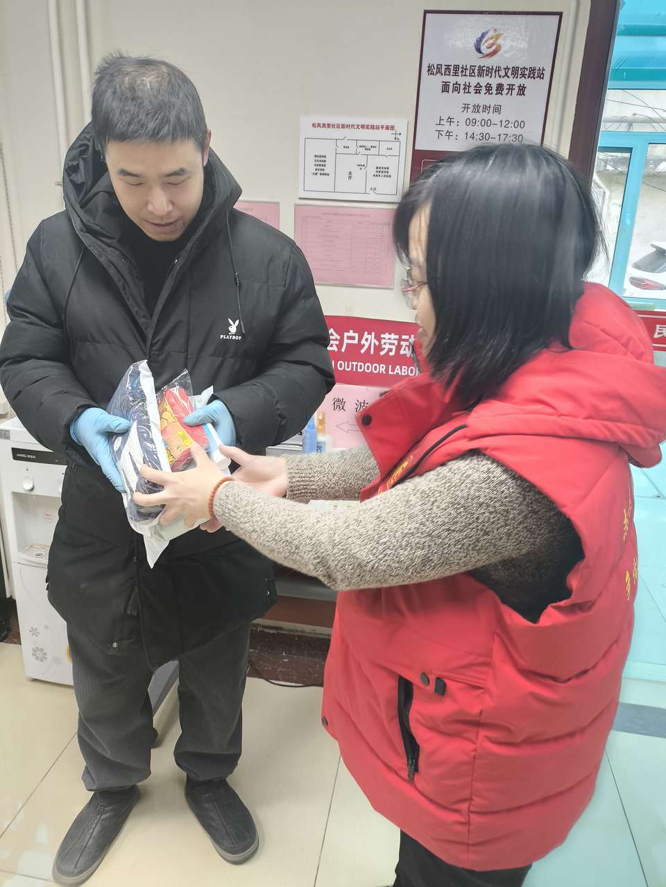 活动向“两司两员”群体送上防寒手套、围脖、暖贴、护手霜等设施,同时向他们讲解劳动法律法规知识,介绍工会服务政策,宣传工会驿站功能。街道总工会在东瑞家园社区党群服务中心工会驿站开展了“当一天站长”活动,工会负责同志对工会驿站的饮水设备、微波炉、充电插座、休息桌椅、应急药箱等设施进行检查,以保障工会驿站能在寒冷天气持续发挥功能。