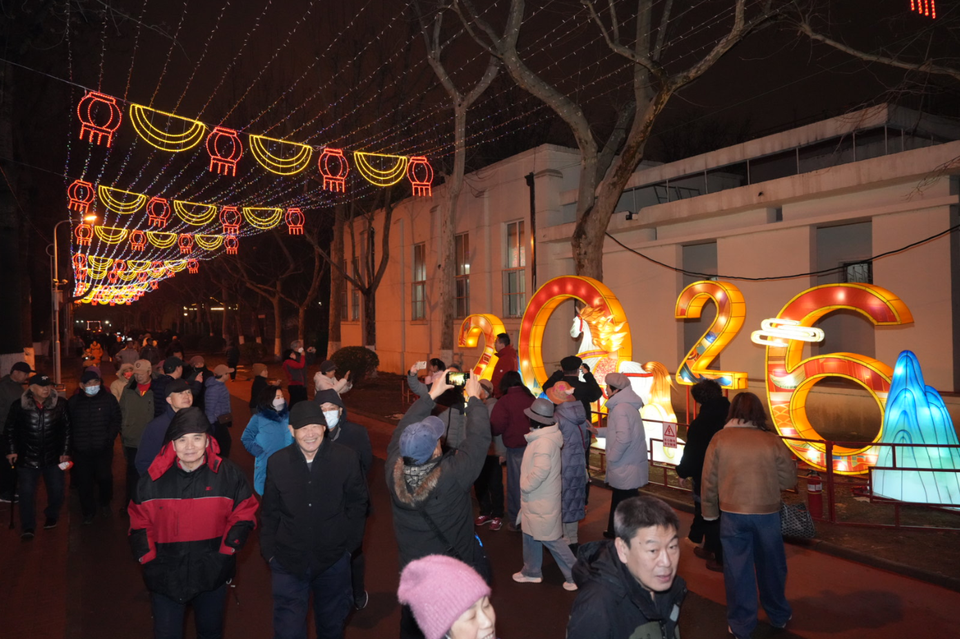 藤萝架前,“龙马精神”灯组通体透亮。骏马昂首,马蹄下的圆球灯光流转,映得周围一片暖色。一位年近60的老人站在灯前,举着手机,对着镜头喊:“再往中间靠一点,好,好,别动——”快门声响起,七位老人的笑脸定格在灯影里。这七个人年龄都在六十岁上下,因为爱好旅行而相识,每年元宵节,都会相约一起来二宫看灯。其中一位老人笑着说:“这已经是第五年了。”今年的“龙马精神”灯组让他们格外满意。同行的一位阿姨站在灯下仰头看了半晌,说:“马年嘛,就得看马的灯。这个做得好,看着就喜庆,有精气神儿。”她的爱人接过话头:“往年也好看,但今年这个最贴合,龙马精神,多吉利。”几人拍完合照,又各自找角度拍单人照。有人站在灯侧,比了个手势;有人凑近看灯上的细节,招呼同伴过来一起端详。路过的人被他们的热闹感染,也停下来抬头看那组灯。当被问到“明年还来吗?”的时候,牵头拍照的老人笑着应道:“来啊,年年都来。”