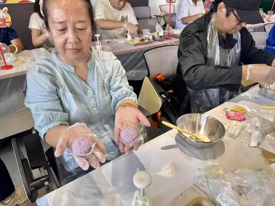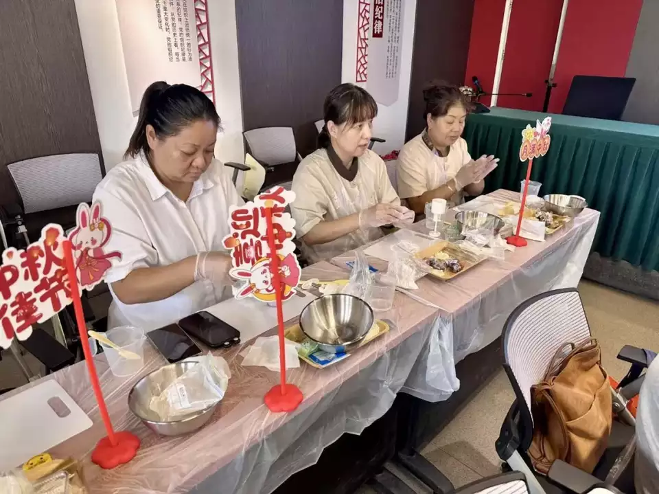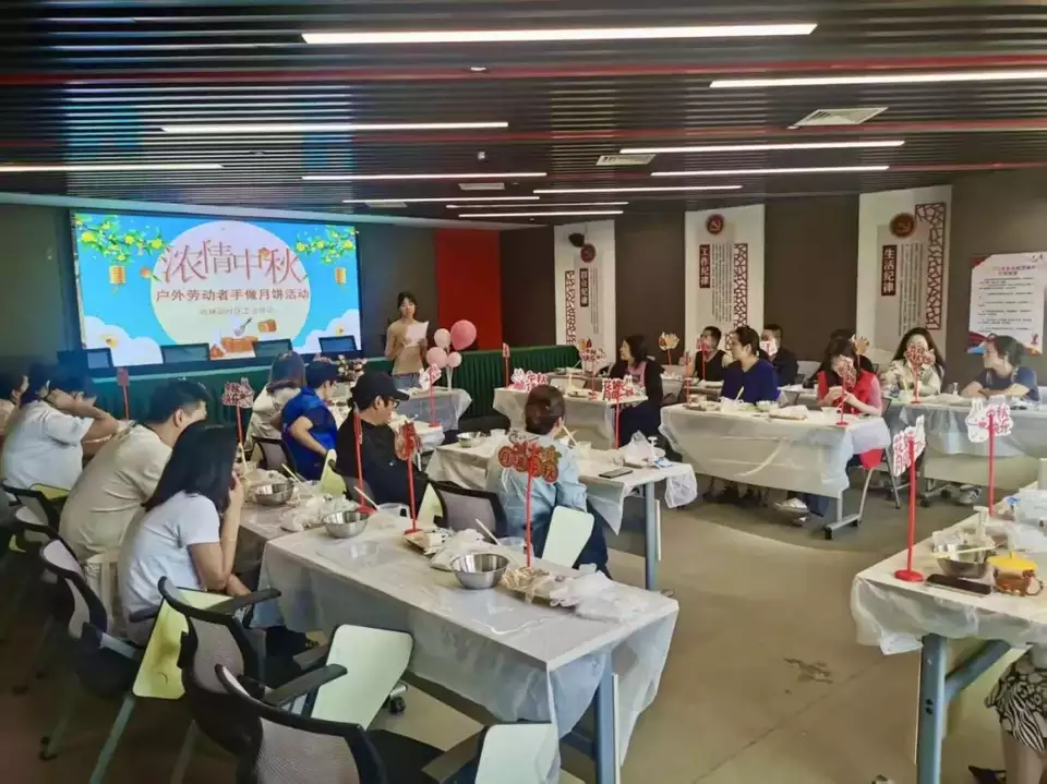活动现场温馨祥和,来自不同职业的户外劳动者们走到一起,大家在老师的带领下揉皮、包馅、压模,有的揉面时沾了一脸面粉,有的包漏了馅,惹得大家阵阵欢笑。经过近1小时的努力,一个个印着“花好月圆”“平安喜乐”的月饼整齐排列。活动还开展了知识讲座,重点宣传了工会职工普惠相关政策。结合工会干部当一天站长活动,对参加活动的户外劳动者进行了爱心互献。