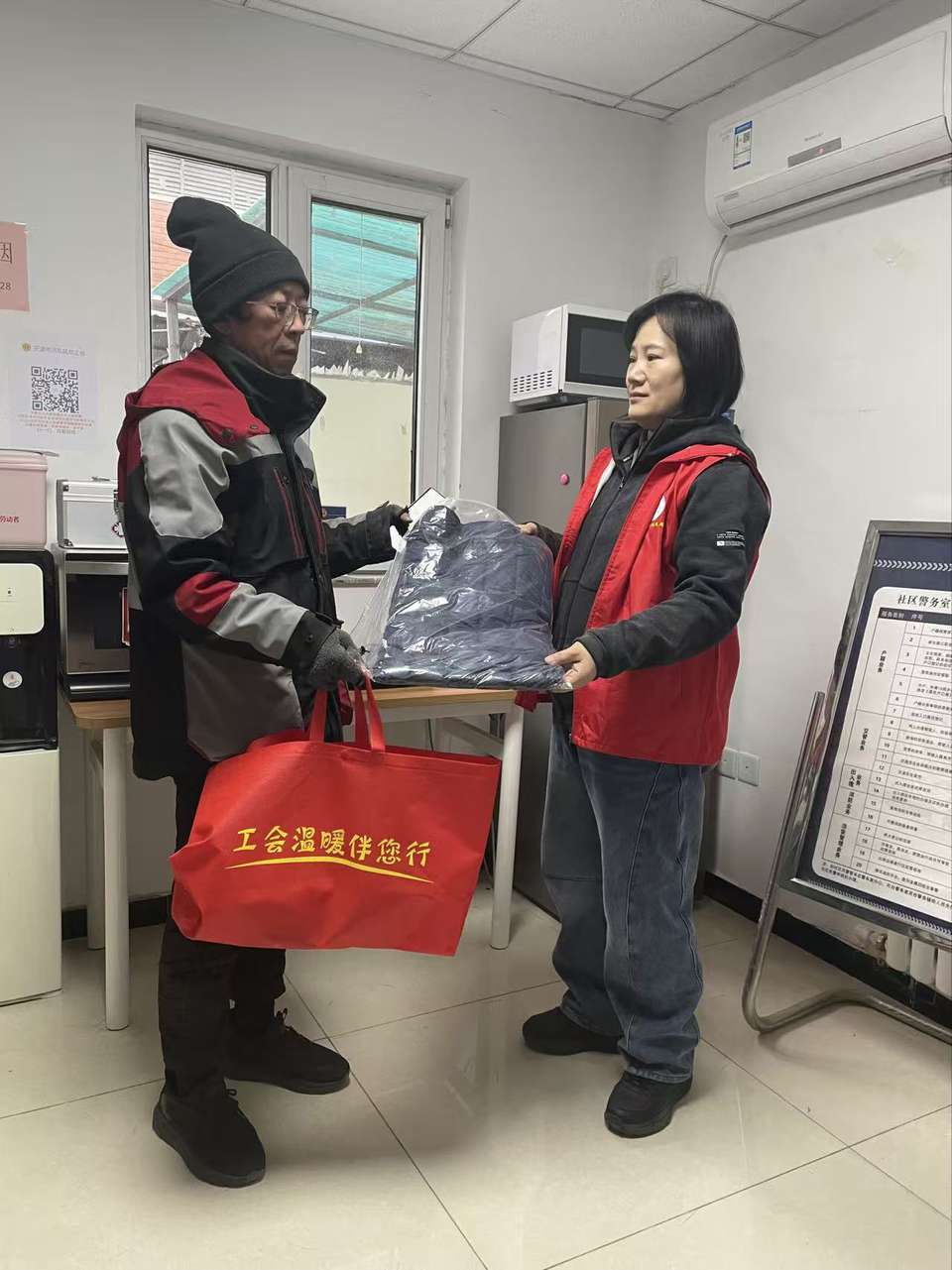 活动现场,工作人员将羽绒坎肩、围巾、棉手套、暖手宝、护手霜等物品递到大家手中,希望大家注意防寒保暖,并叮嘱大家在外奔波注意安全。同时,积极向户外劳动者们介绍了工会驿站的服务内容,希望大家多来体验和使用。还开展“当一天站长”活动和爱心互献活动,收集大家对驿站服务的意见建议以实际行动提升驿站服务效能,将募集到的棉衣、家用小电器等物品赠送给户外劳动者,让让寒冬中奔波劳作的户外劳动着感受家一样的温暖。