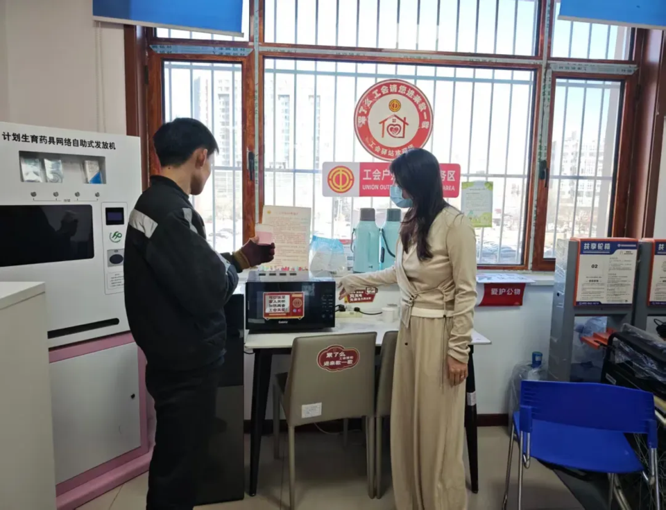 神州花园社区党群服务中心工会驿站工作人员邀请户外劳动者走进驿站,介绍服务项目:打热水、加热饭菜、免费提供暖手宝等保暖物资,进站体验的快递员表示:“天气冷,刚跑完几单快递,手脚都冻僵了,在这能喝上热乎乎的水,太感谢工会组织啦!”